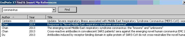 This will bring up a search box. Search for the reference you wish to insert. You can search by the authors name or a keyword to find the right citation. Select the citation you wish to import and press insert.